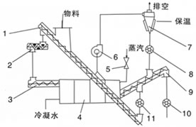该机的设计采用了热传导和热辐射的原理,物料经供料螺旋进入干燥机内,在壳体旋转管束外围铲子的搅拌作用下与换热管充分接触,使其水分得到蒸发,同时推进铲将物料由进料端输送到出料端。干燥一般采用逆流加热方式,根据需要也可采用顺流加热方式。